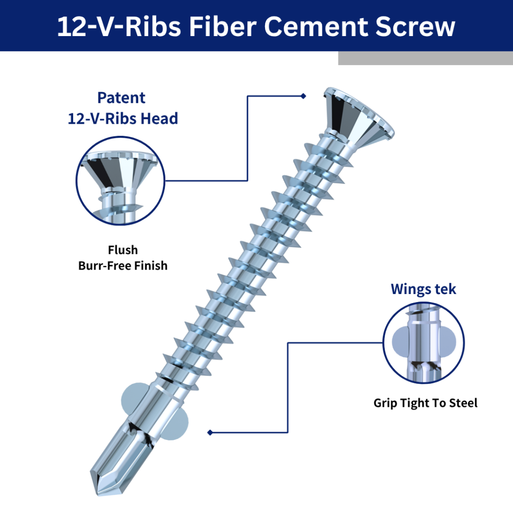 At Fong Prean, we understand the demands of fiber cement applications. Our screw offerings include specialized countersunk 12-V-Ribs Head screws, self-drilling TEK point screws, and reamer wing options for steel framing.