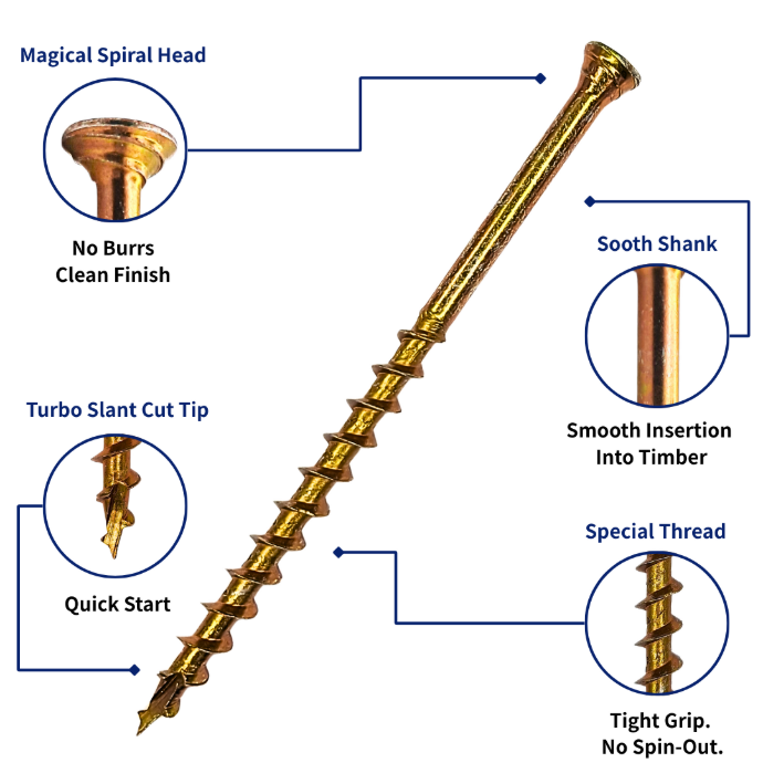 With its MS countersunk head, the screw draws the wood down neatly to deliver a flush, clean finish on the timber surface. The Turbo Slant Cut Tip enables fast starting and smooth penetration without pre-drilling, improving installation efficiency and helping save time and labor on site.