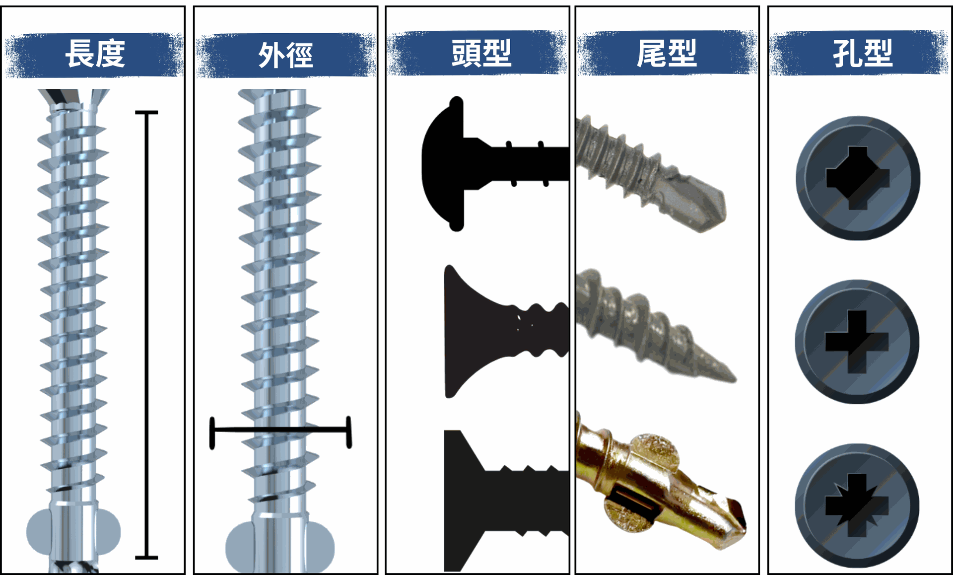 注意:螺頭一定要有切削齒,才能沉平不滑牙。 - 尾部: 尖尾:用於木頭,鑽尾:用於鋼材,雙翼鑽尾:可適用木質+薄鋼複合結構,特殊尾型:用於更厚的纖維水泥。